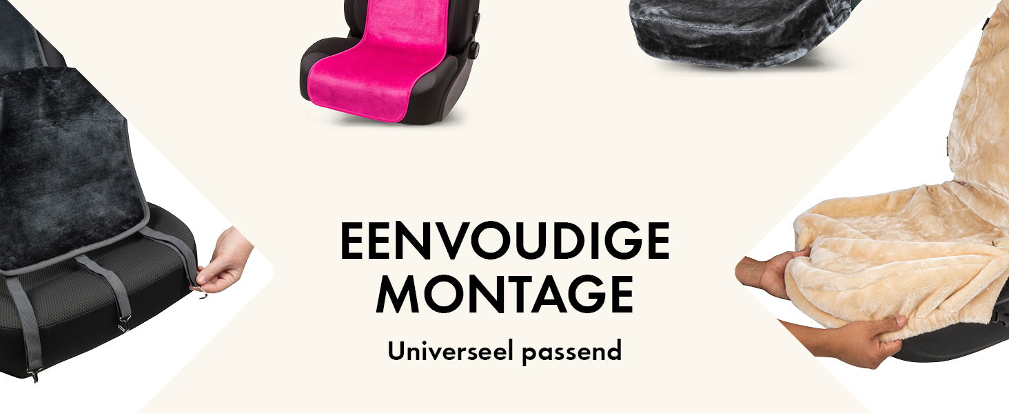 is in een handomdraai gebeurd: plaats de bekleding op de autostoel, schuif de twee bevestigingsschijven tussen de zitting en de rugleuning en bevestig de haken onder de voorstoel. De hoes zit al perfect op zijn plaats, glijdt niet weg en geeft je auto een stijlvolle, gezellige uitstraling.Voor de behoedzame verzorging en reiniging van dit product adviseren wij om het met een vochtige doek te reinigen.